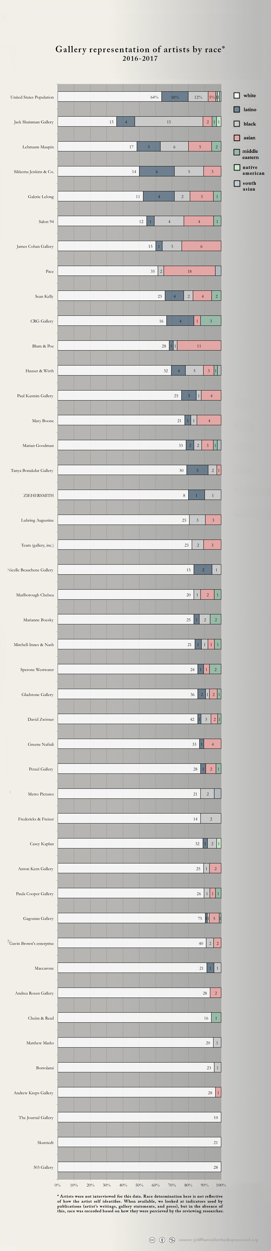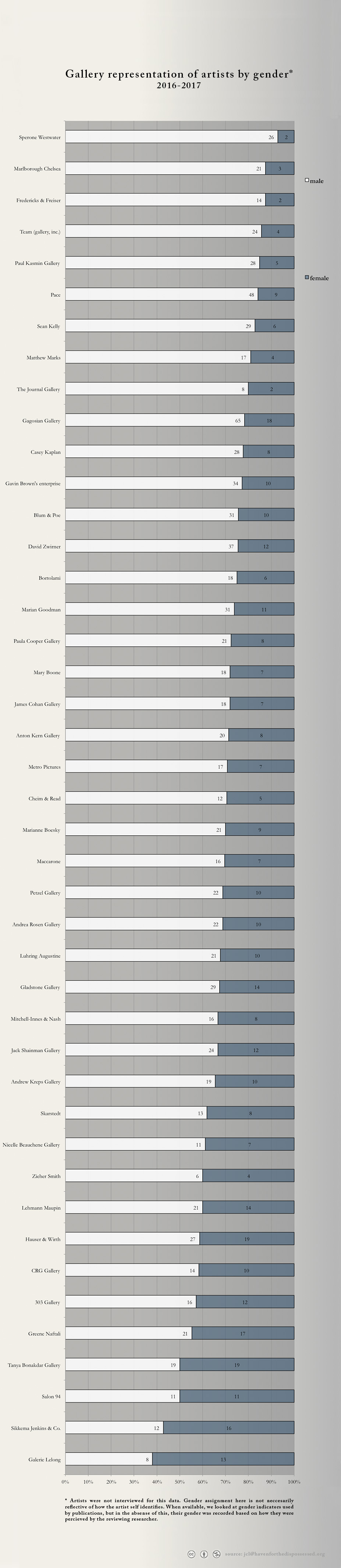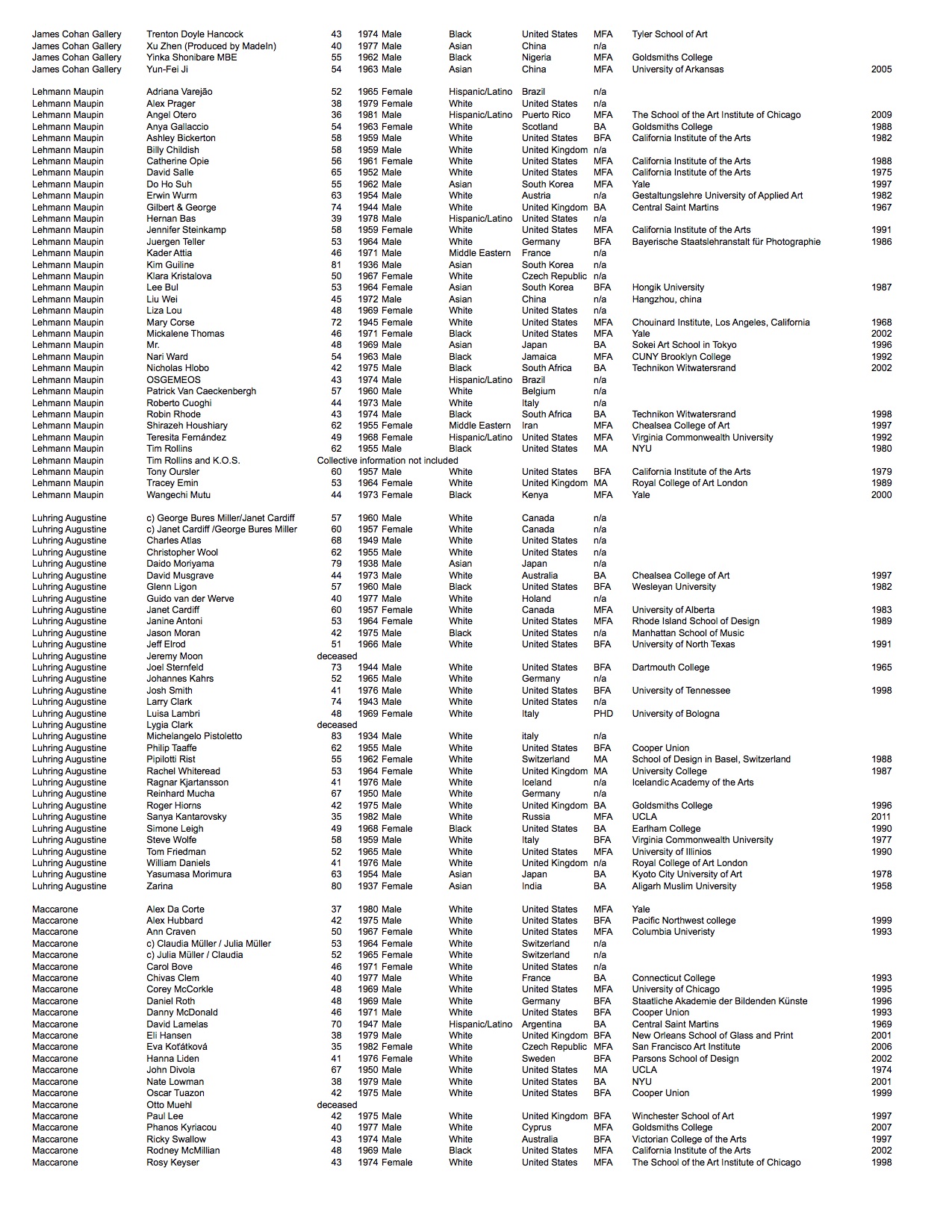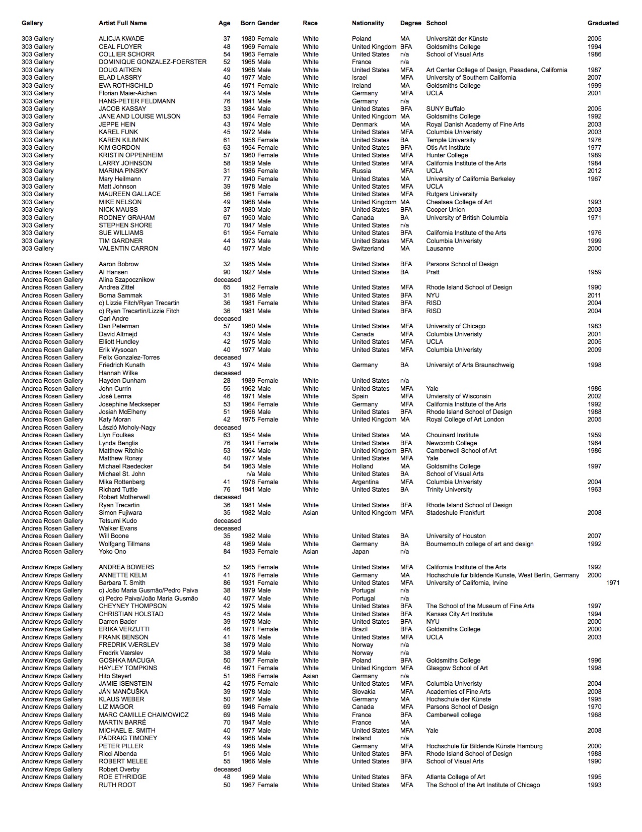 Gallery rosters change frequently. The data listed is of the artists represented as of fall 2016. In the time since this project has concluded two of the galleries have permanently closed: Andrea Rosen Gallery and CRG.