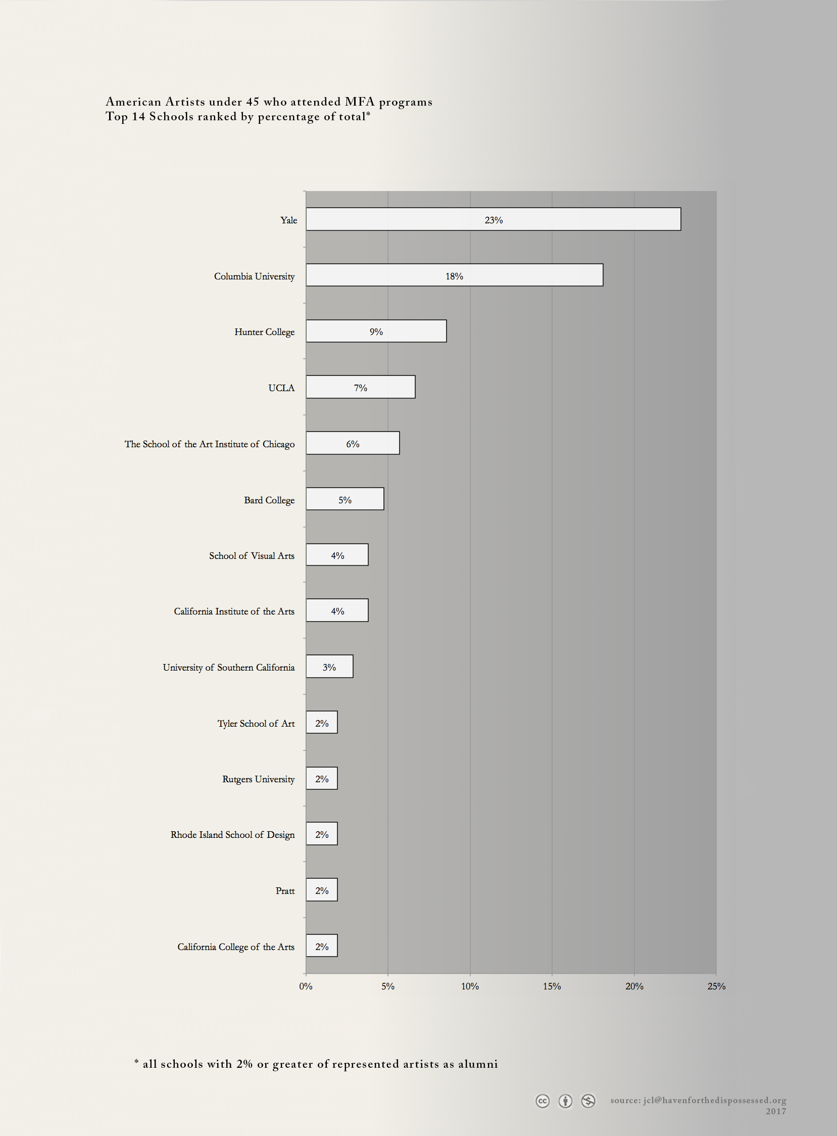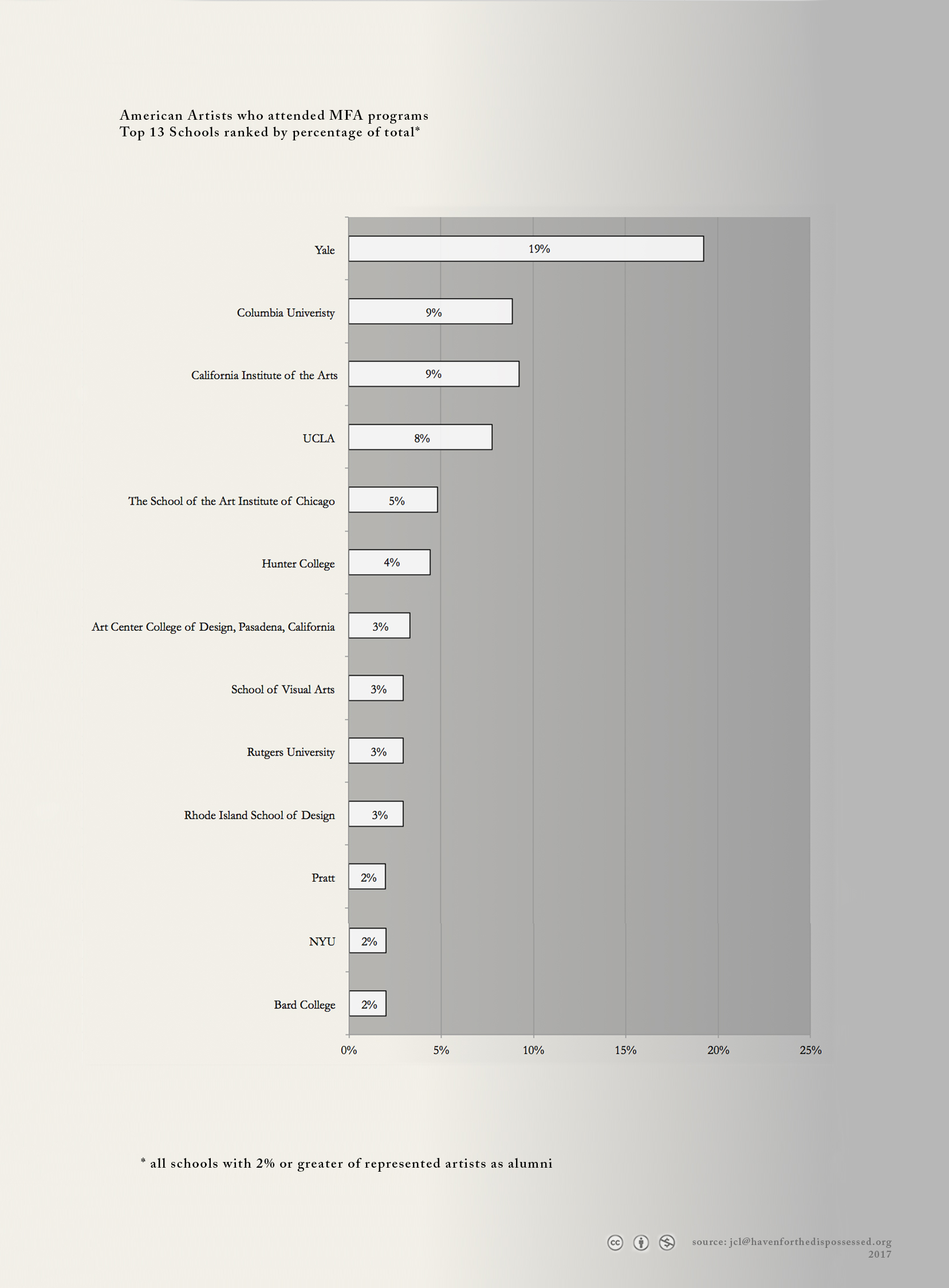 We built a database of 1300 artists represented at the top 45 commercial galleries in New York. We researched each artist noting their: Age, Race*, Nationality, Gender*, and Education (highest degree, institution, and date of graduation).