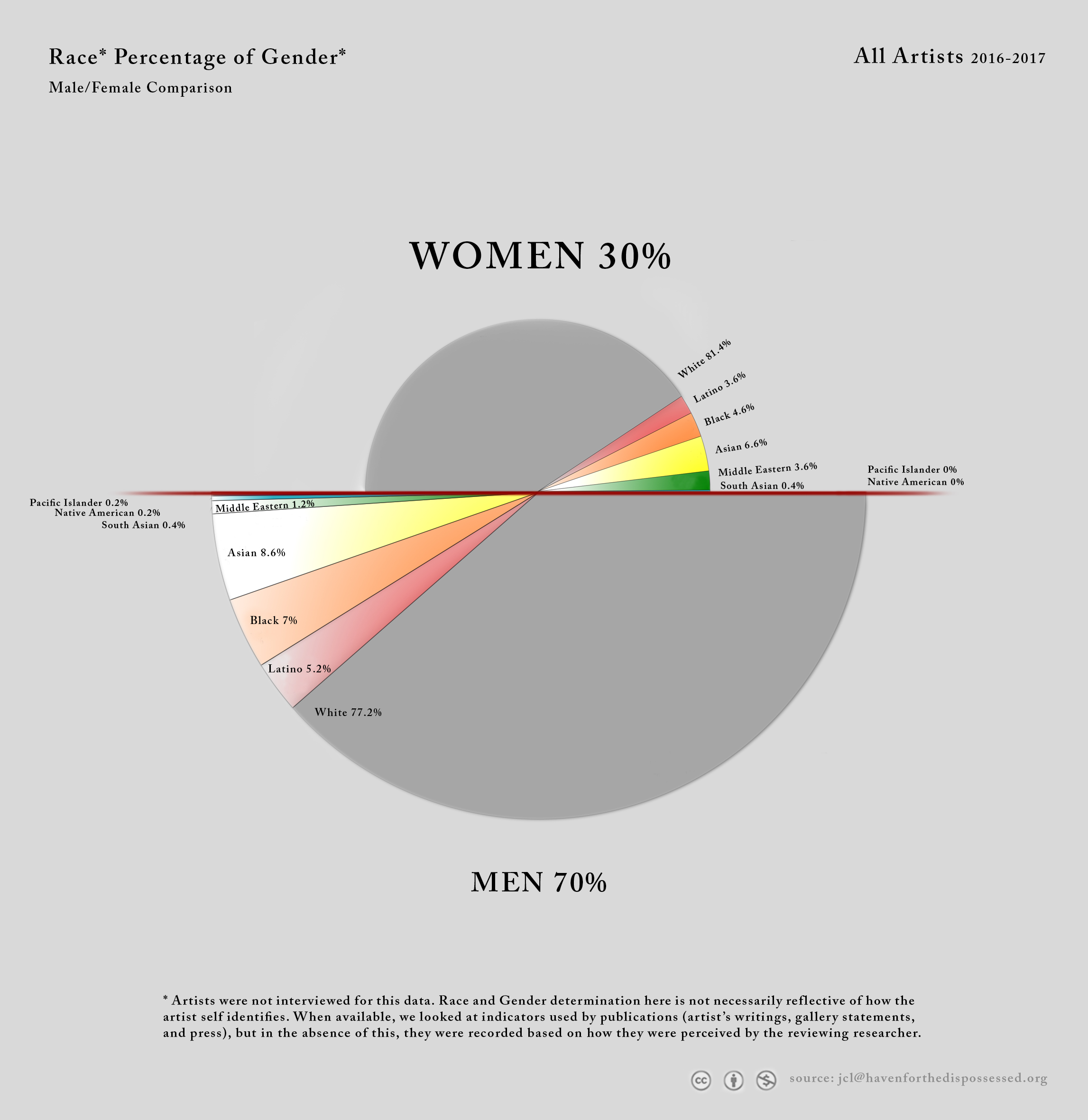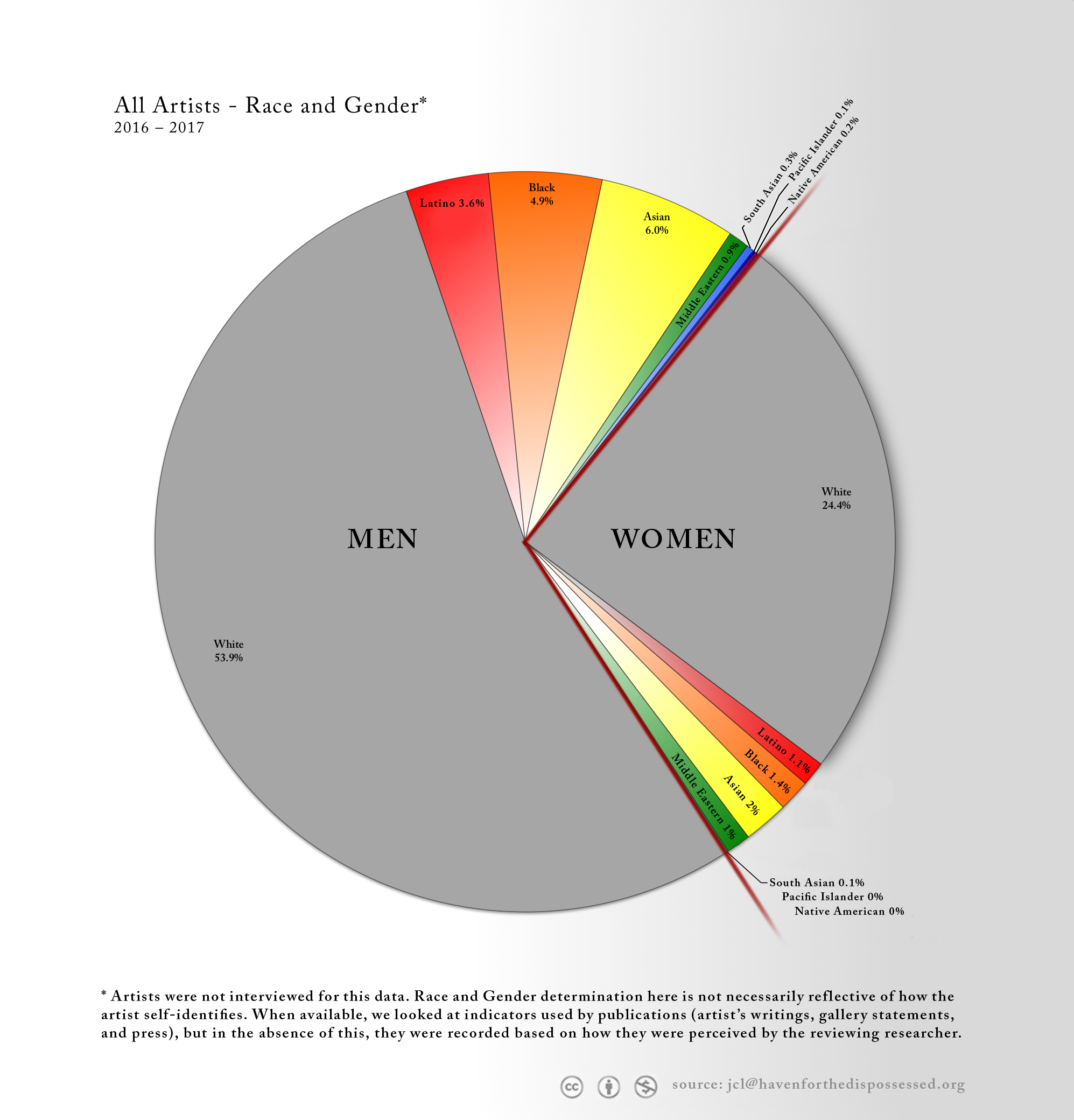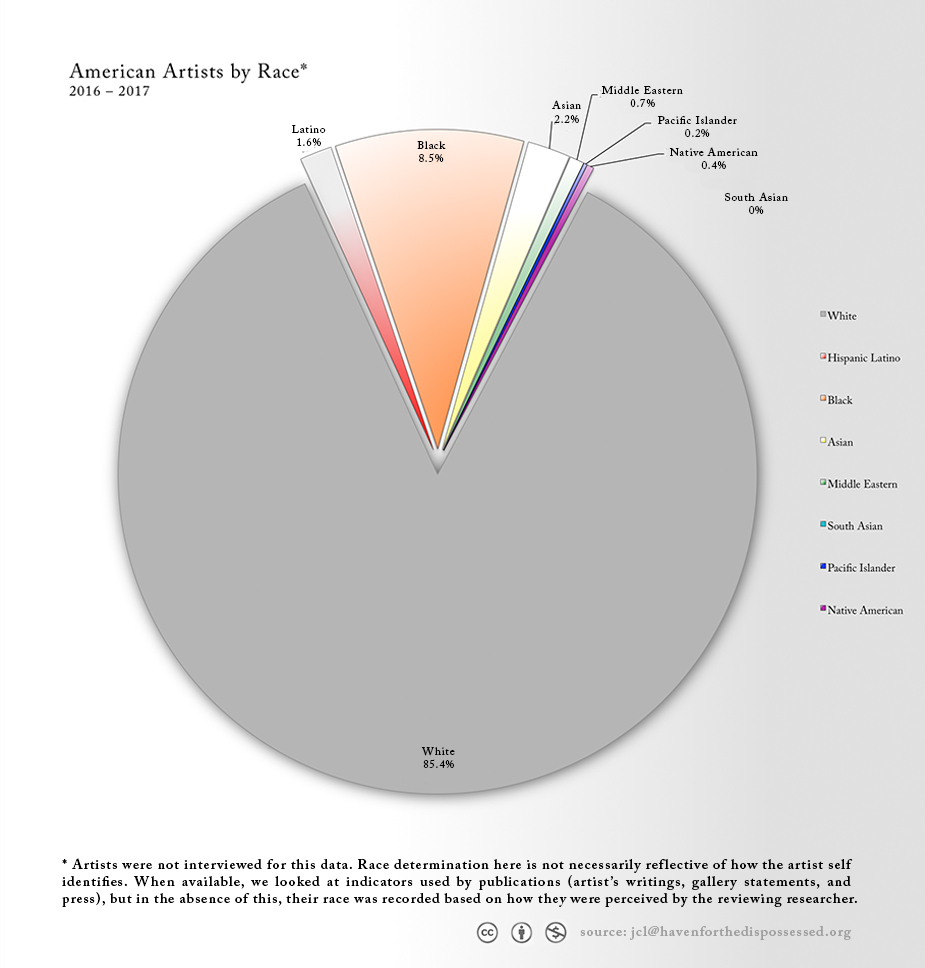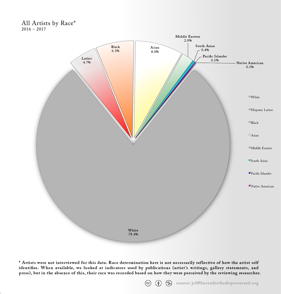 To determine race and gender we looked at how the artist has been written about by publications and the gallery. When that information was not available the reviewer used their best personal judgement based on indicators that stood out to them. For this reason we were not able to identify any of the artists as trans or non-gendered.