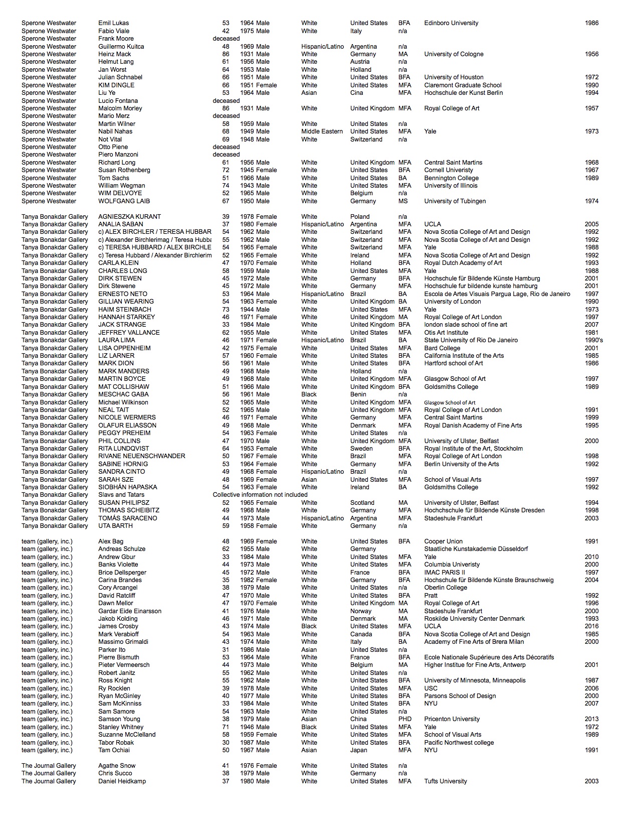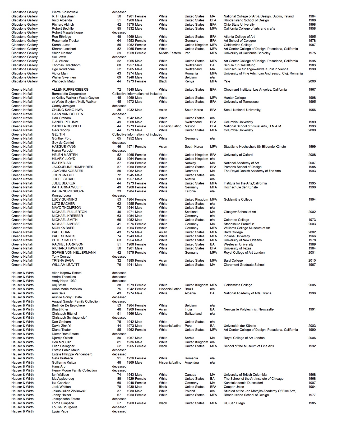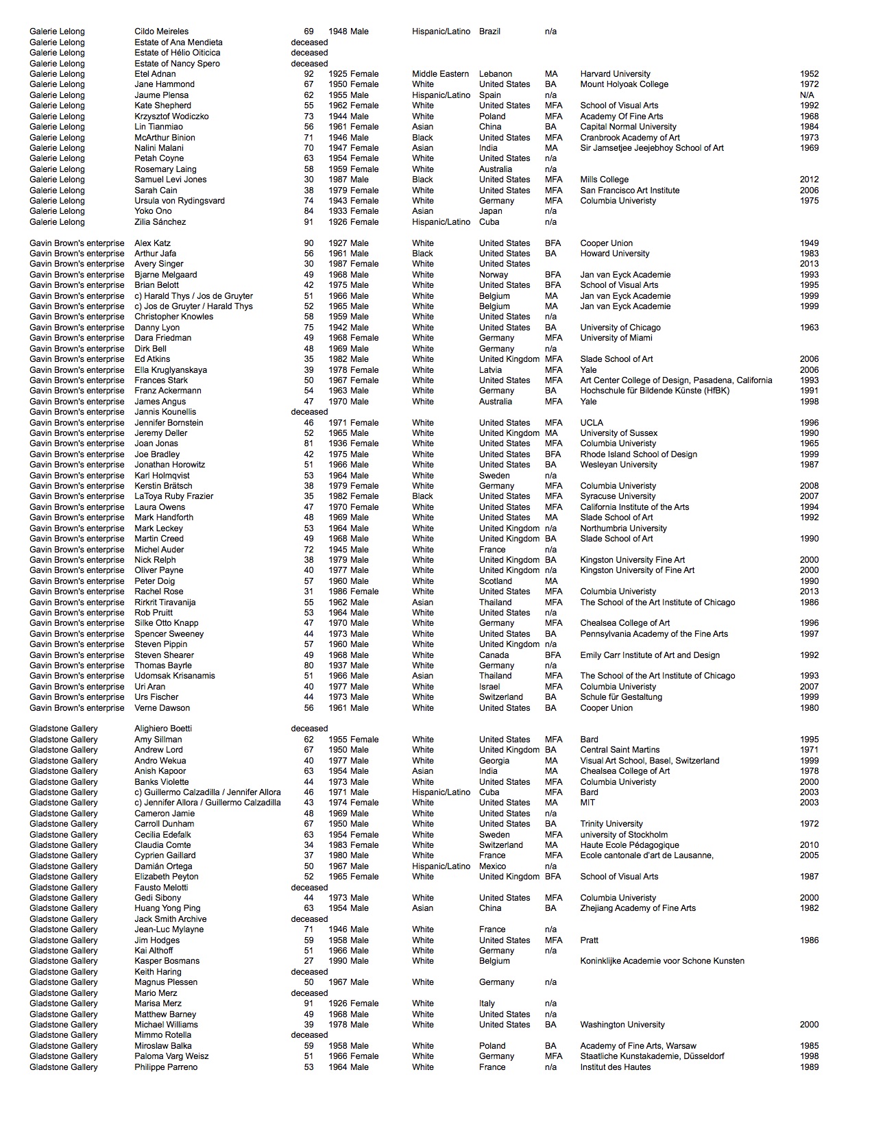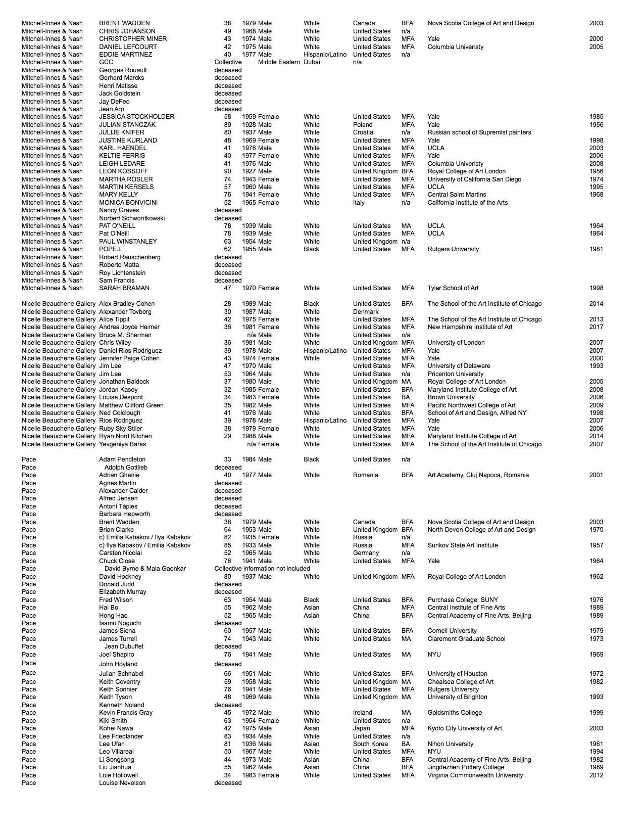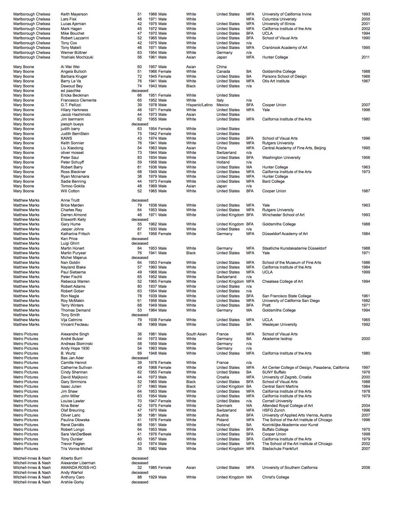 We looked at each artist publicly represented by the galleries and recorded available biographical information: looking at age, nationality, highest level of education, where they attended, graduation year, their perceived gender*, and race*.