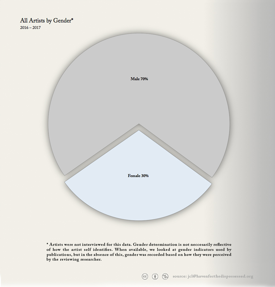 *Artists were not interviewed. Gender and race determination is not representative of how that artist self-identifies. When available, we looked at indicators used by publications (artist's writing, gallery statements, and press), but in the absence of this, race and gender were recorded based on how they were perceived by the reviewing researcher.